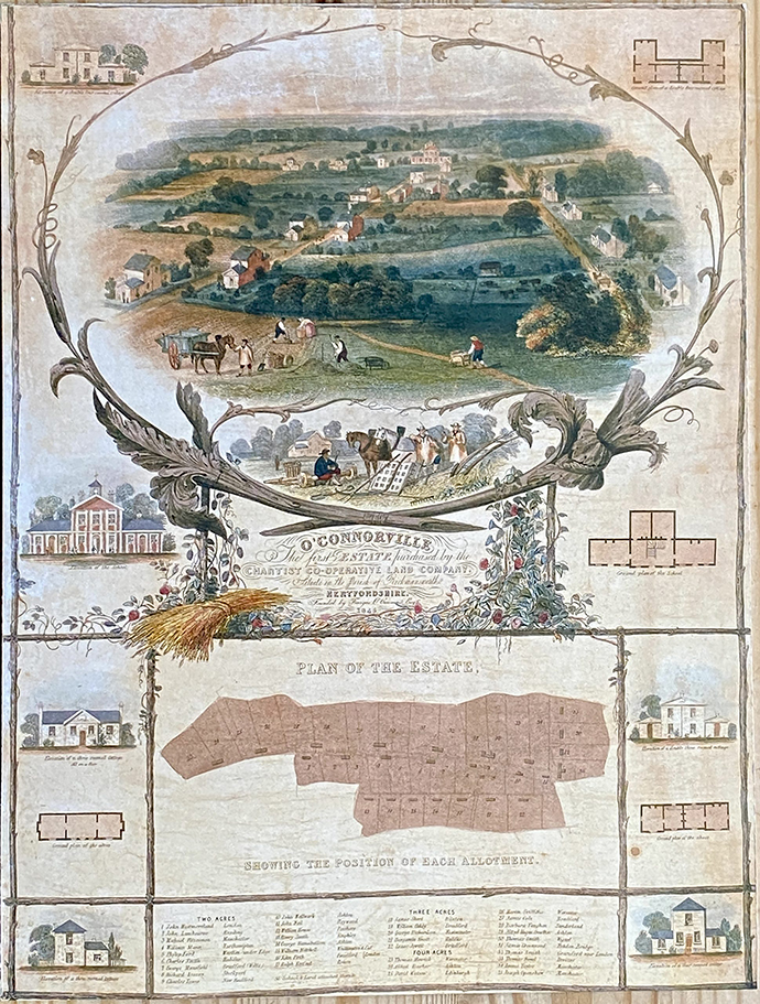 Otra de las corrientes que nutrió el proyecto de vuelta a la tierra fue el movimiento cartista. Frustrado con las vías parlamentarias, un sector del cartismo canalizó sus energías hacia iniciativas más autónomas a mediados de siglo. Una de las más ambiciosas fue el Chartist Land Plan, un programa de comunidades rurales promovido por la Co-operative Land Company. Esta extraordinaria organización, que llegó a tener 20.000 accionistas y 70.000 suscriptores en su apogeo, buscaba generar beneficios económicos y sociales fundamentales al reintegrar a los trabajadores industriales en el campo. El motor de la iniciativa fue Feargus O’Connor. Para él la tierra era el patrimonio del pueblo, arrebatado por los ricos. Su visión implicaba la creación de comunidades de unas 125 familias, con casas individuales vinculadas a aproximadamente cuatro acres de tierra, dotadas de instalaciones comunitarias como escuelas, bibliotecas y centros de salud. O’Connor defendía que este modelo de pequeñas comunidades podría mantener una población de 300 millones de personas. El concepto mismo de formar una compañía con acciones y beneficios, el énfasis de O’Connor en la pequeña propiedad y el asentamiento de familias en parcelas privadas fueron considerados contrarios al socialismo por algunos, incluido un sector importante del movimiento cartista.